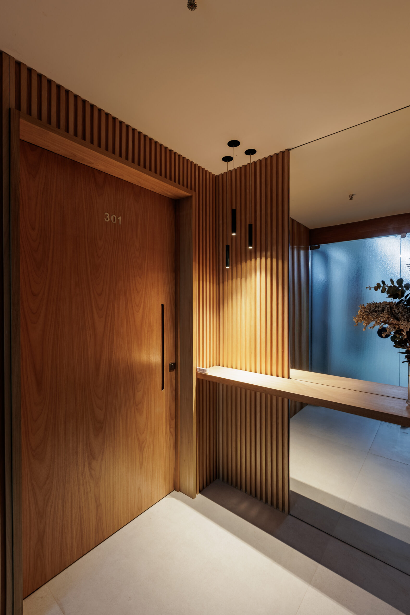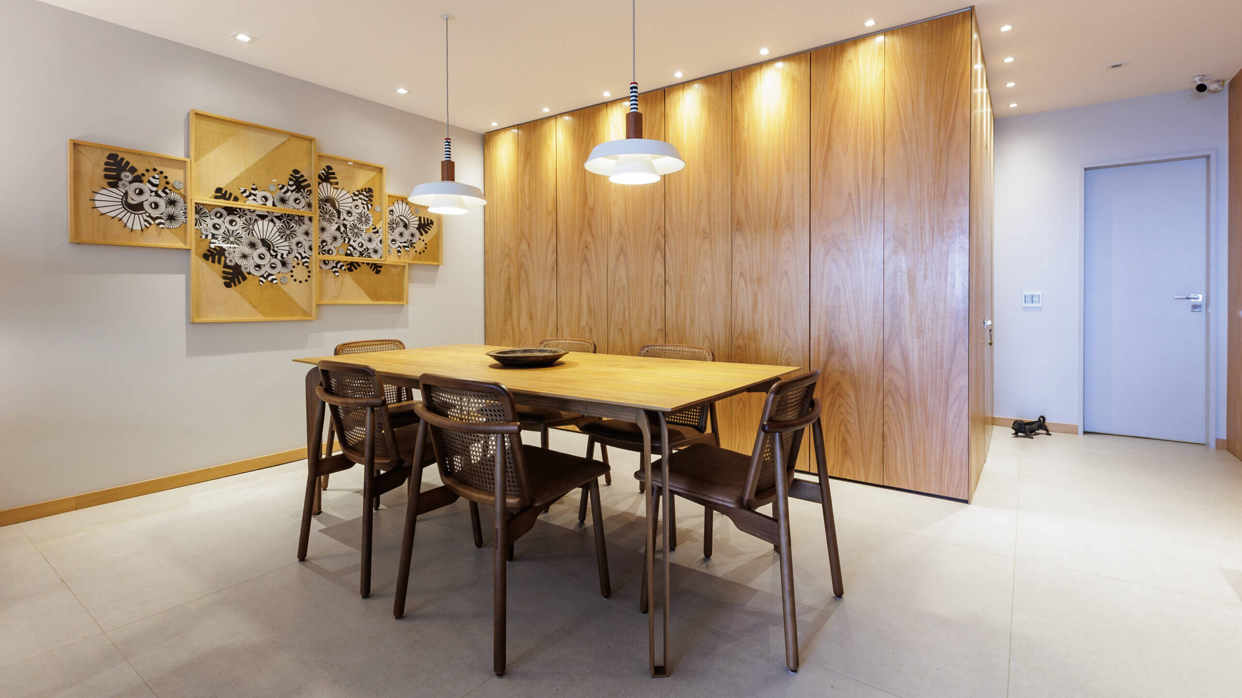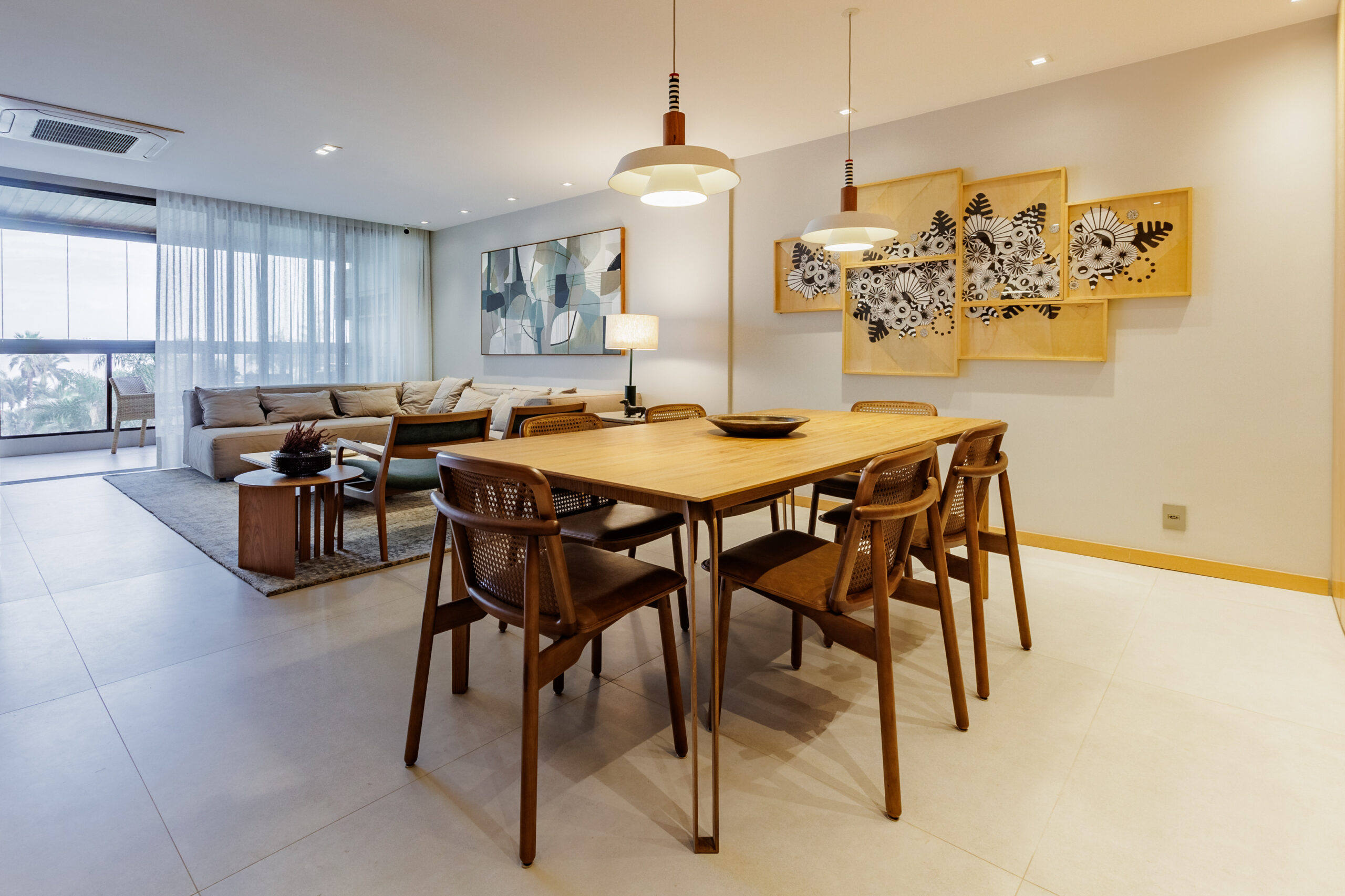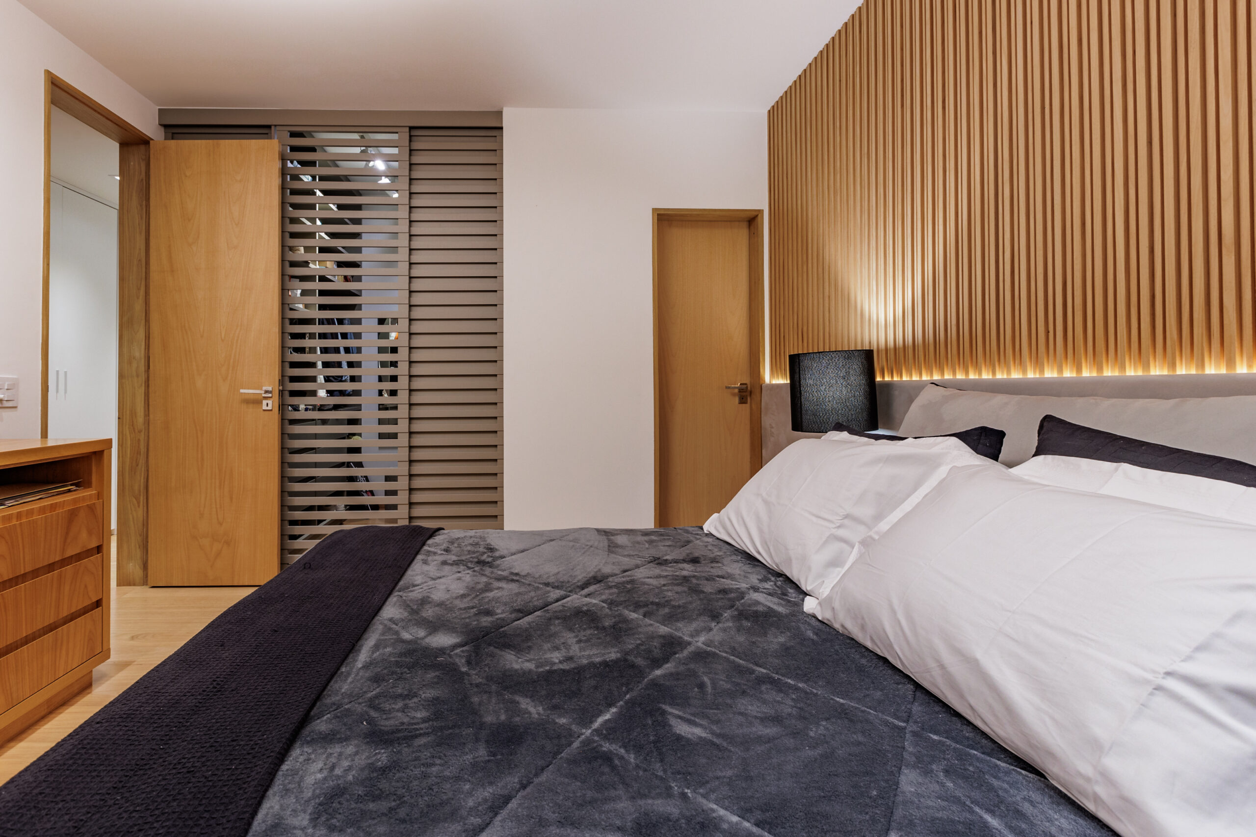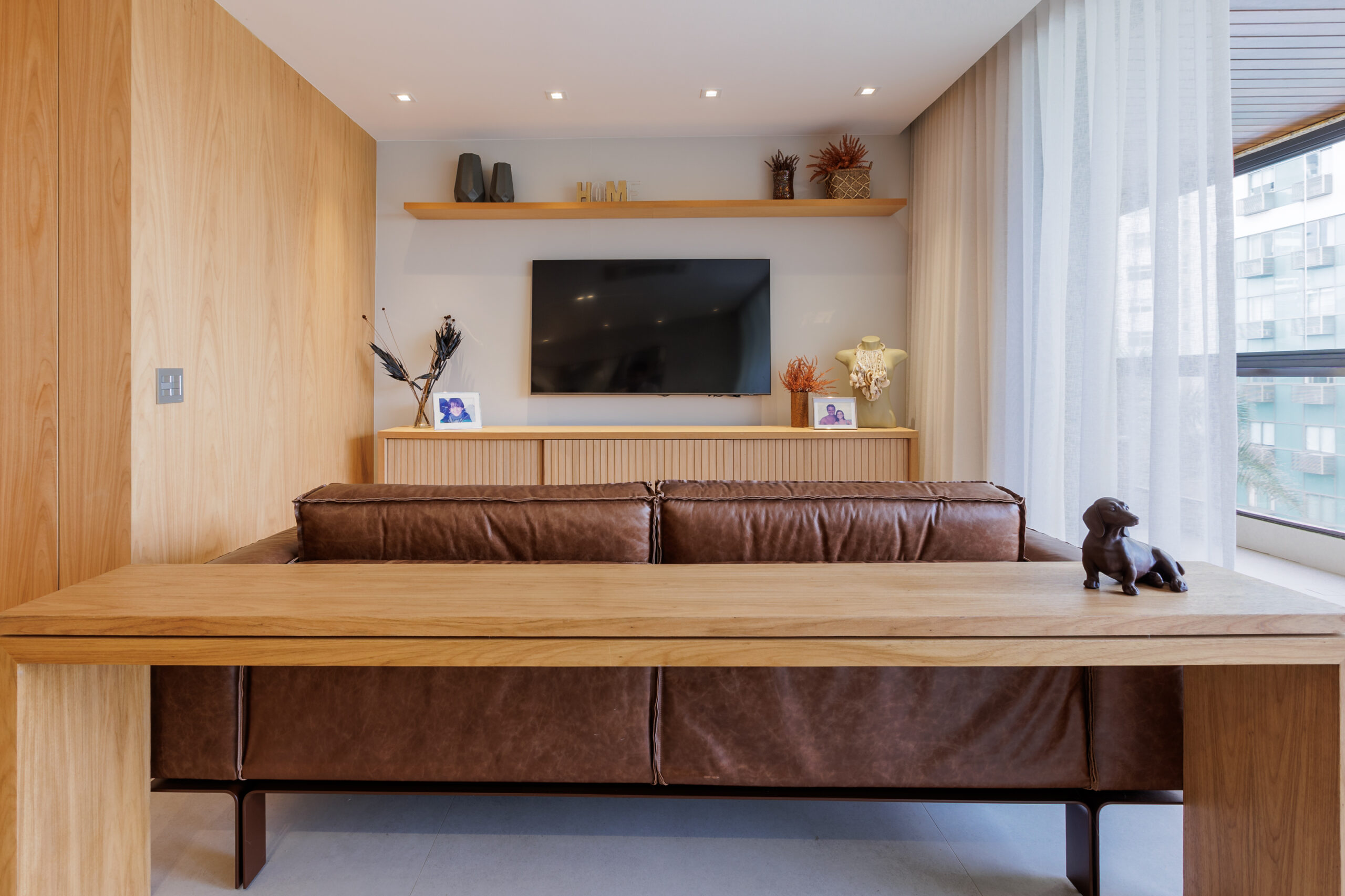 Aumentar a sala suprimindo um dos quartos foi uma dessas soluções que fizeram sentido. Os painéis de madeira tiveram a intenção de equilibrar os materiais mais frios, como o piso cinza, e de mimetizar armários e portas, além de conversaram perfeitamente com o mobiliário contemporâneo utilizado nas salas.