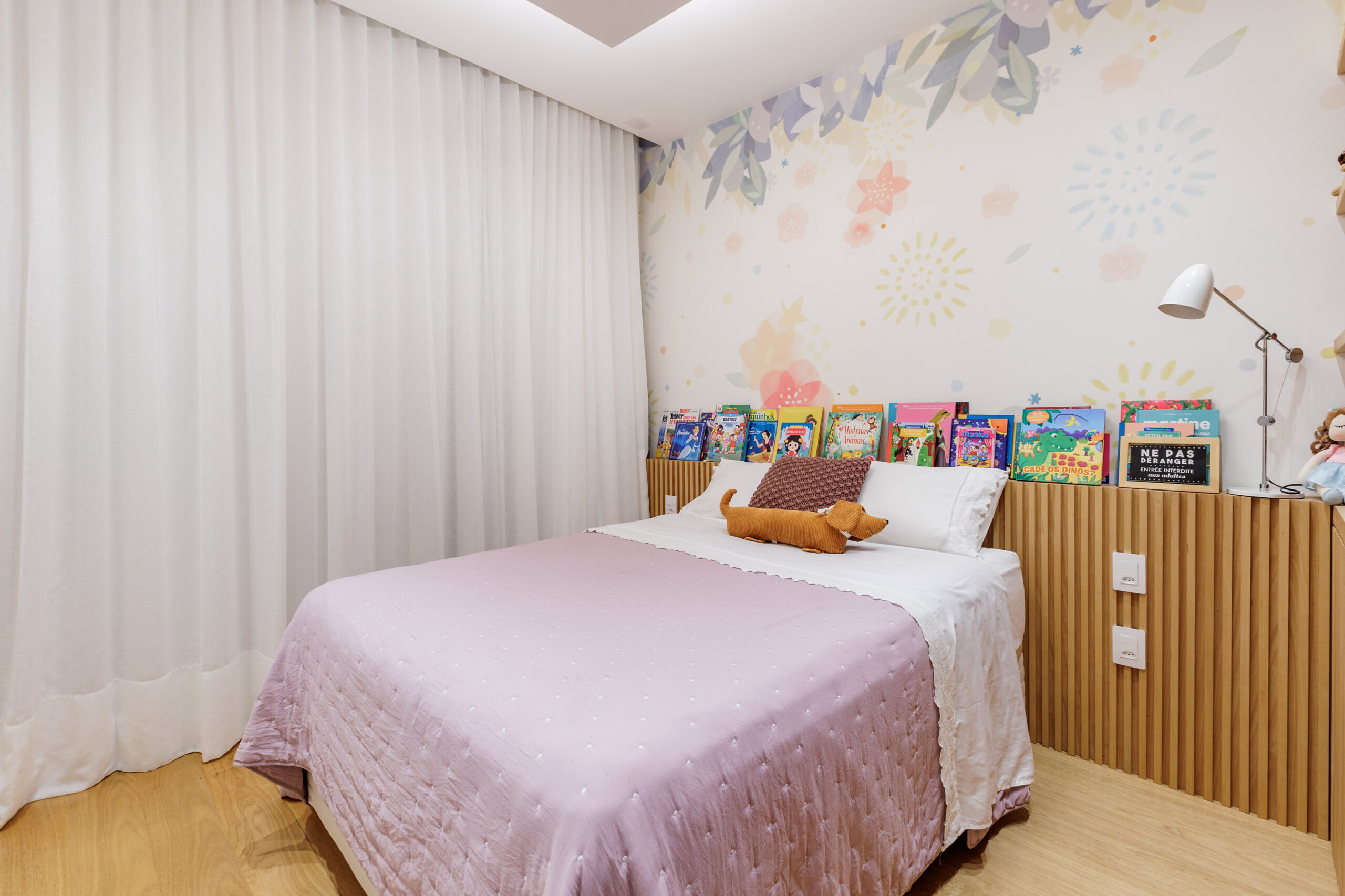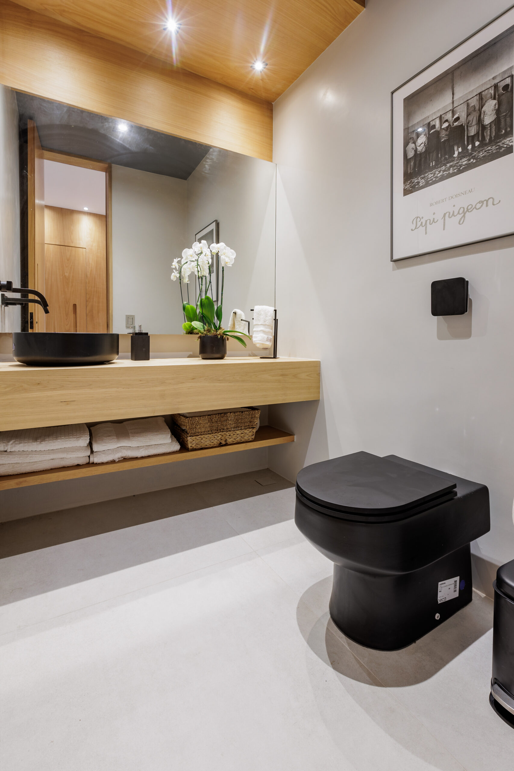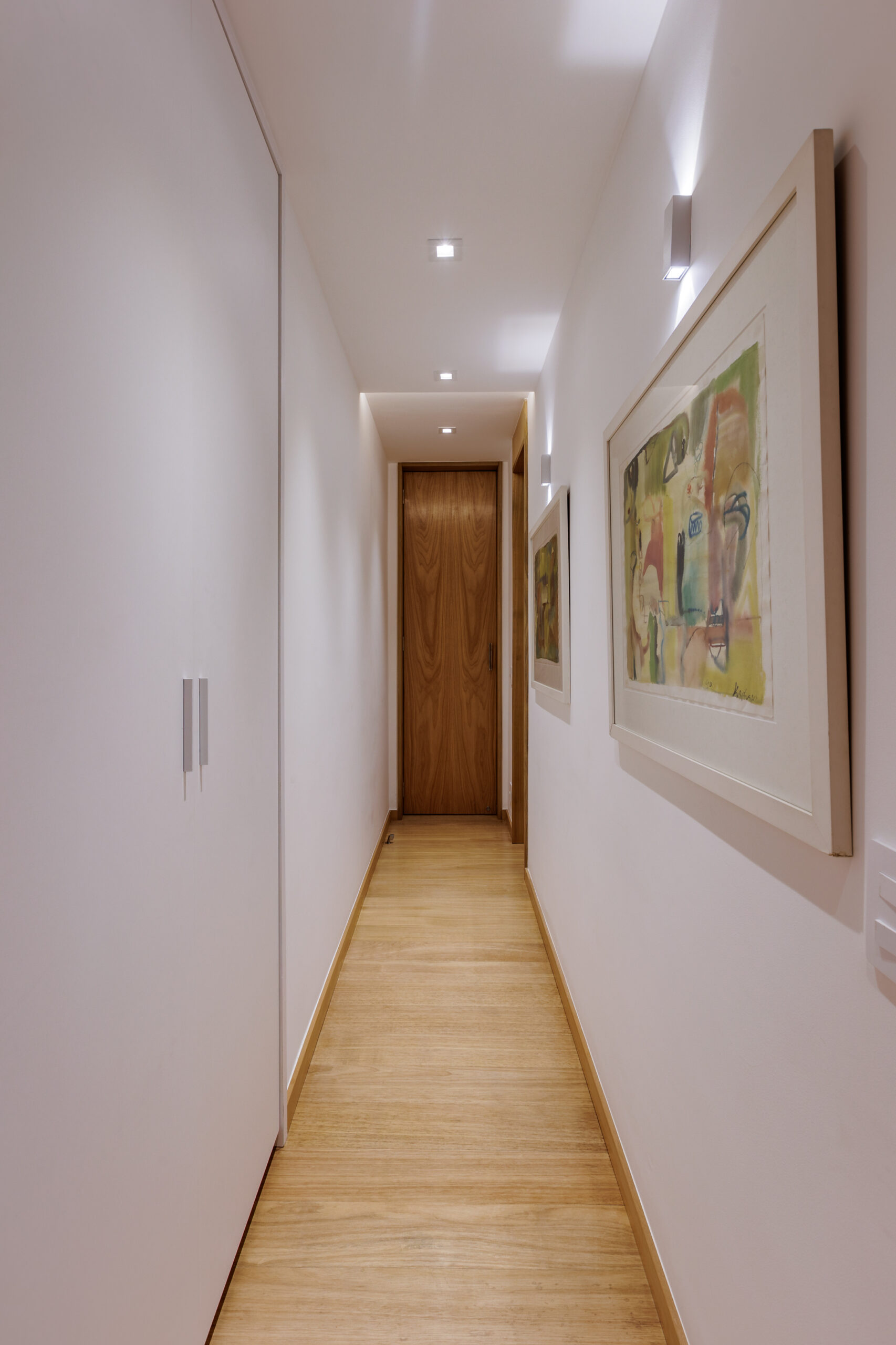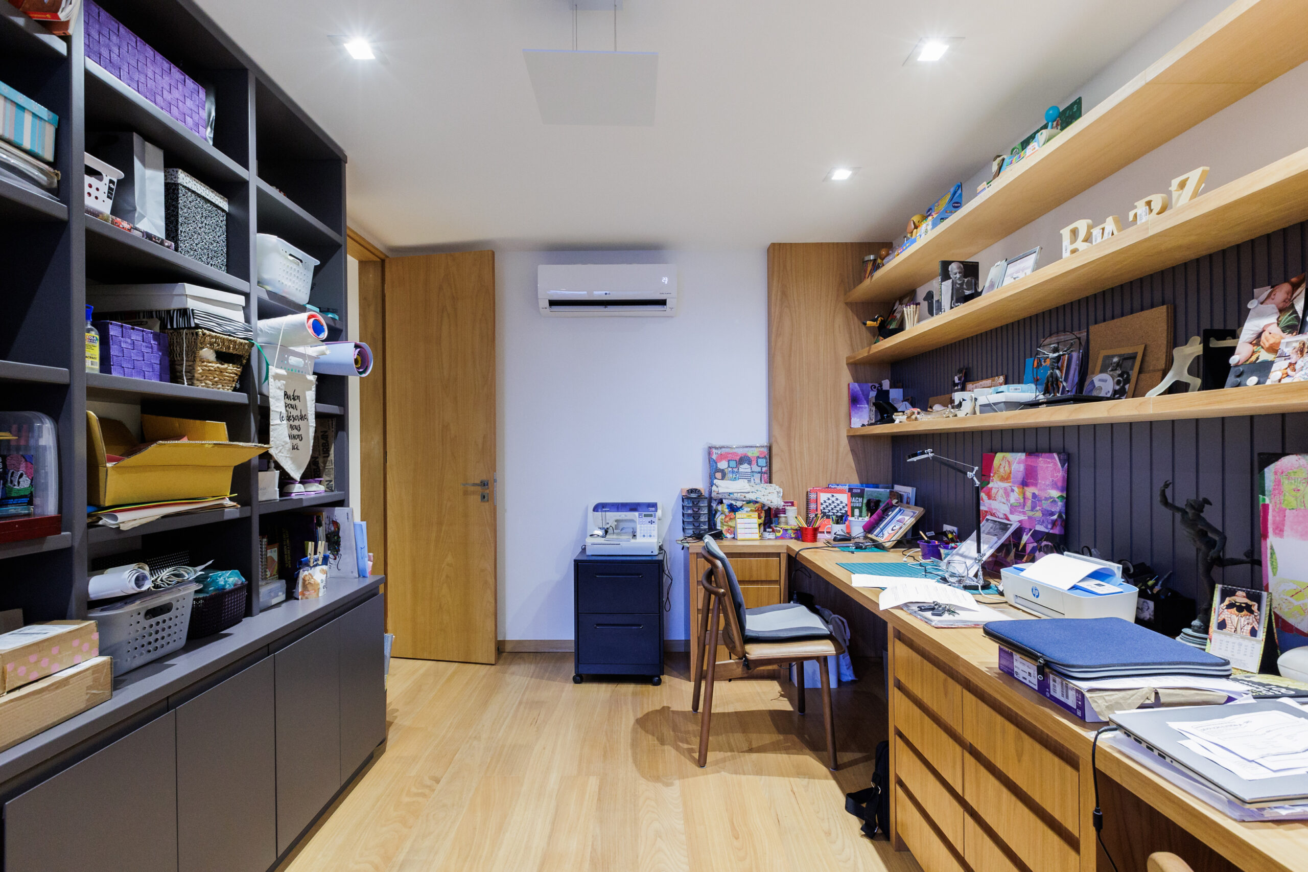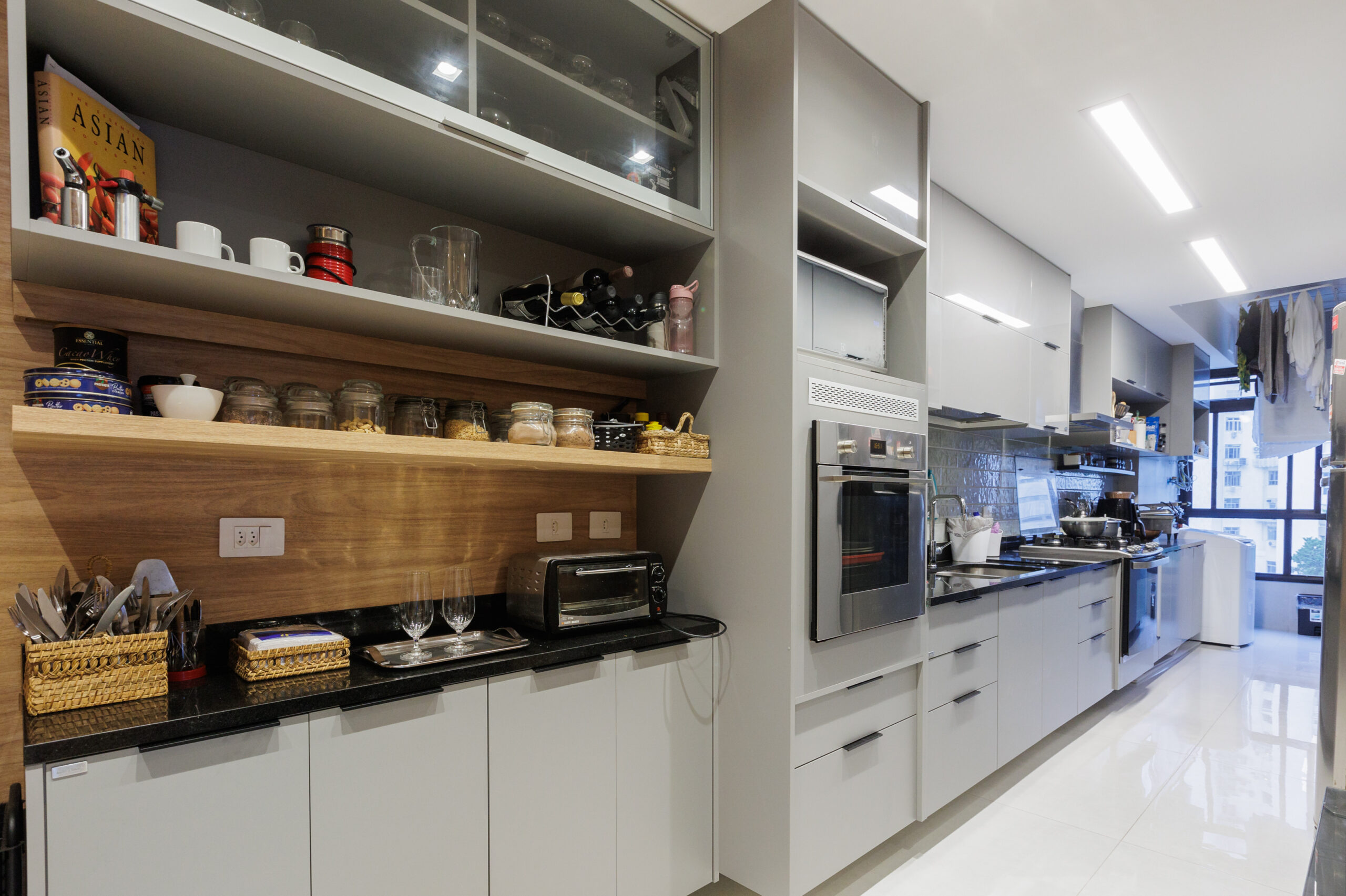 Aumentar a sala suprimindo um dos quartos foi uma dessas soluções que fizeram sentido. Os painéis de madeira tiveram a intenção de equilibrar os materiais mais frios, como o piso cinza, e de mimetizar armários e portas, além de conversaram perfeitamente com o mobiliário contemporâneo utilizado nas salas.