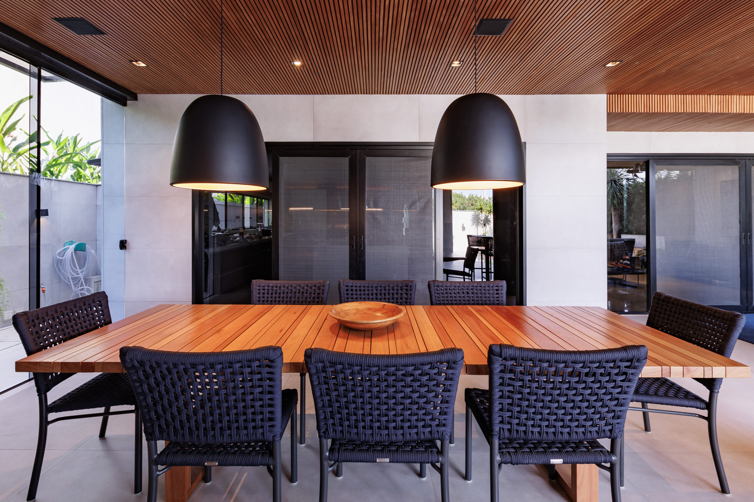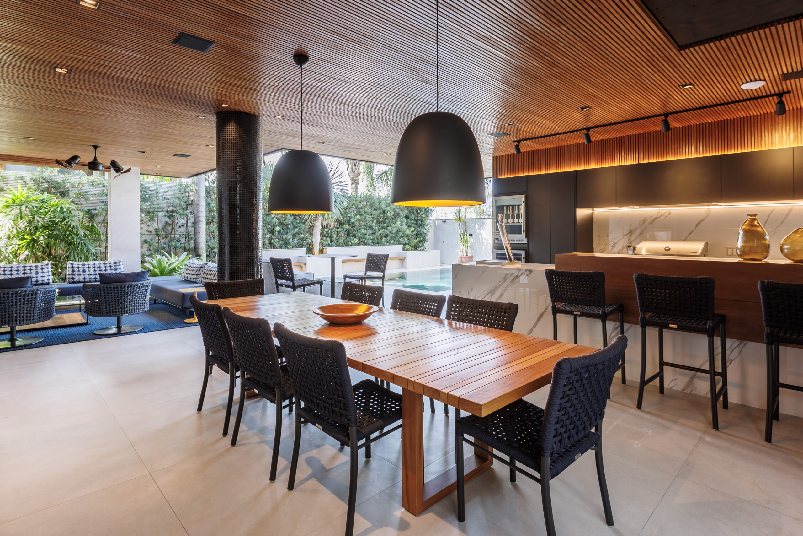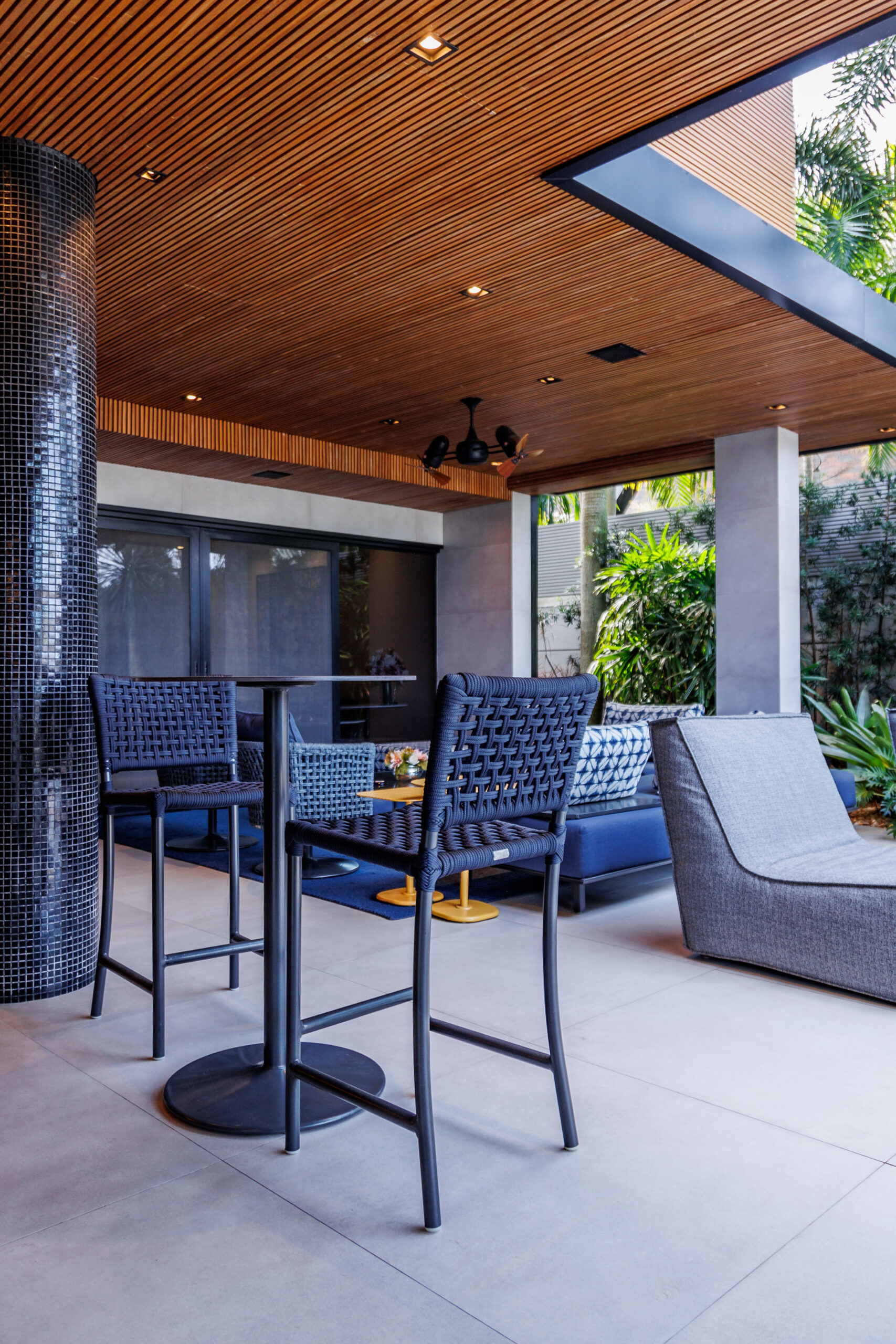 A utilização da pedra hijau, forros em madeira ripada, as cores escuras e o design do mobiliário trouxeram o ar contemporâneo desejado.