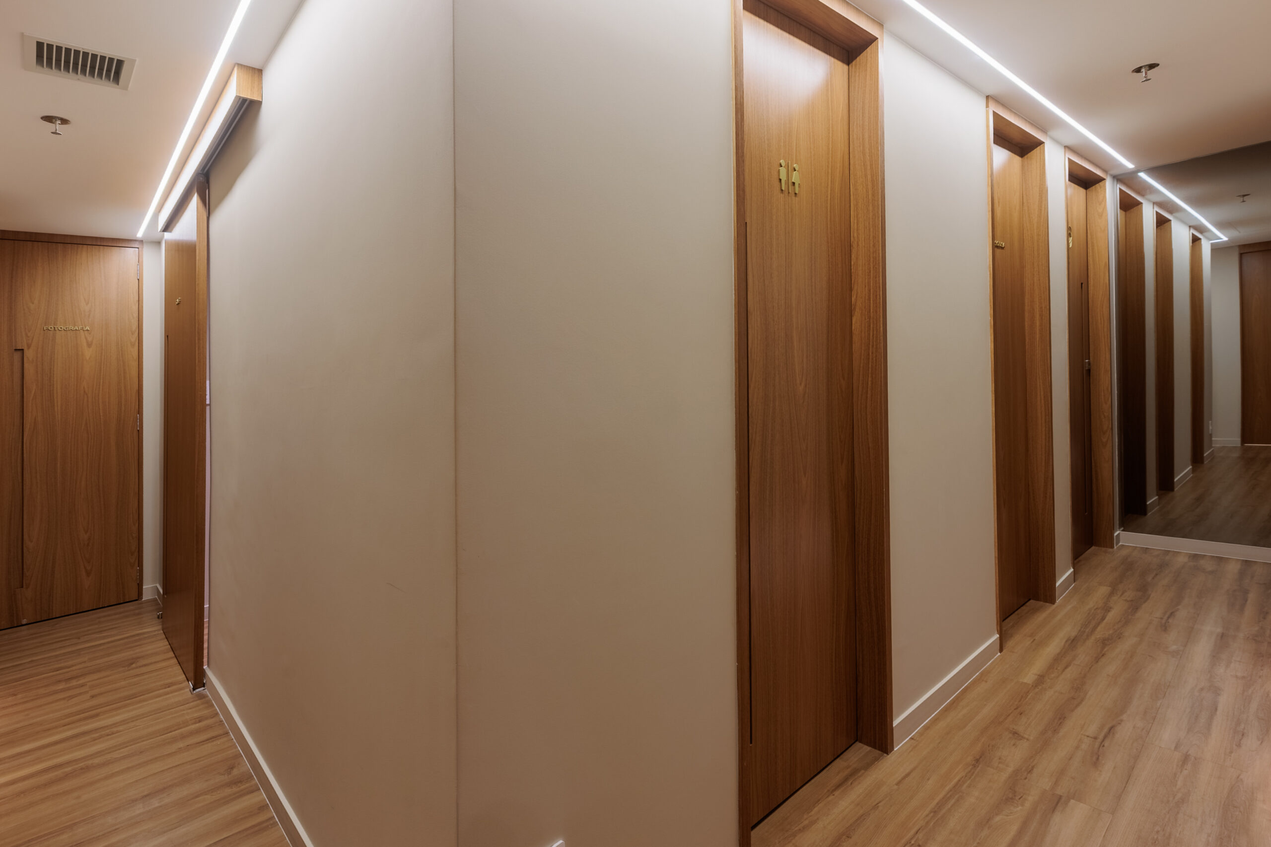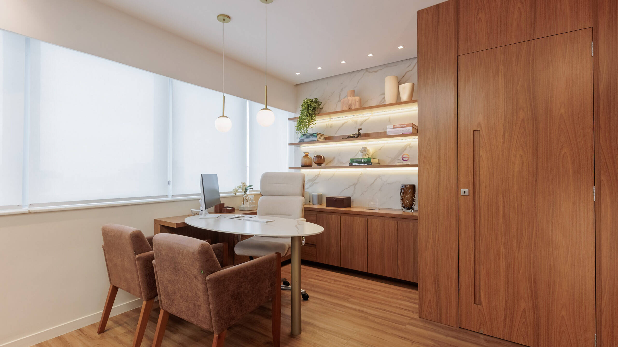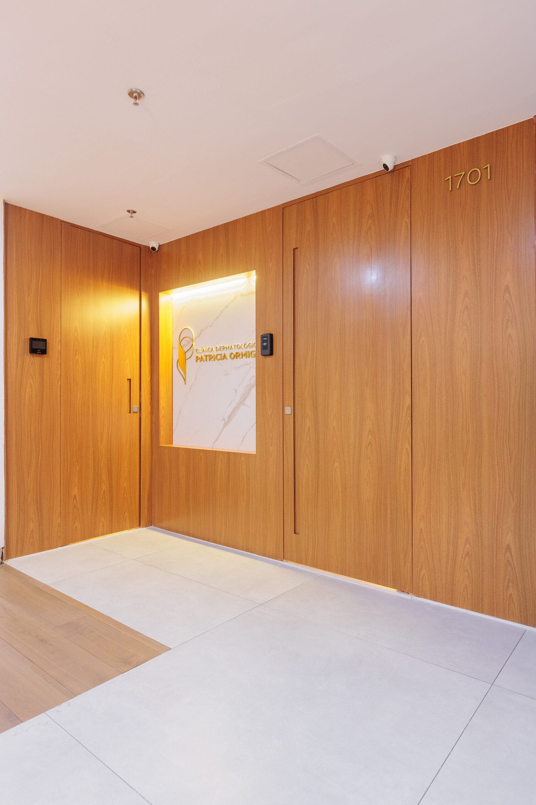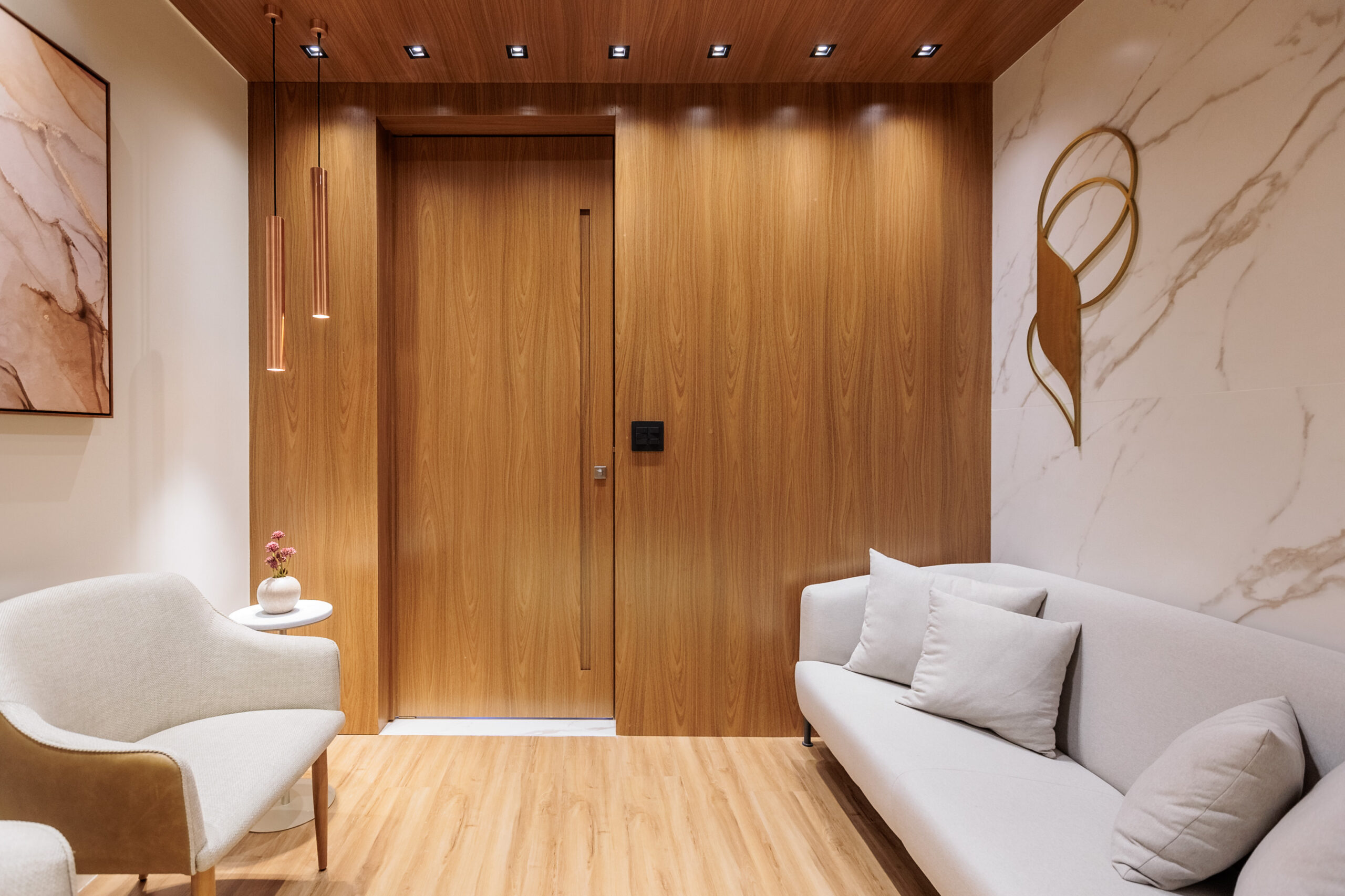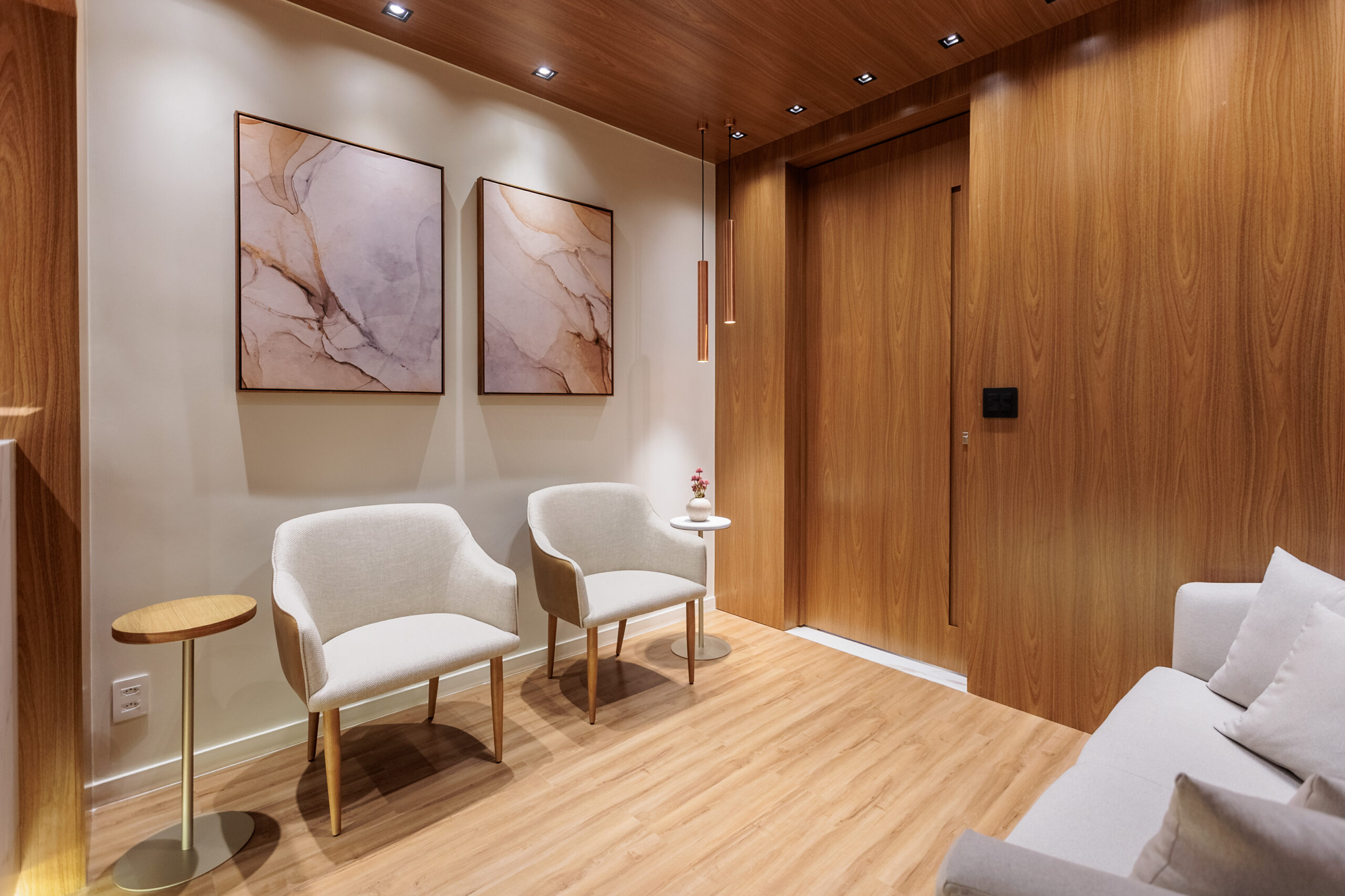 Em 90m², foram organizados três consultórios, 2 recepções, banheiros e áreas técnicas, com percursos independentes para preservar a privacidade. A madeira foi usada para trazer conforto, enquanto a iluminação foi planejada nos mínimos detalhes, para cada uso específico. O resultado é um espaço humano, funcional e sensível às necessidades do cliente.