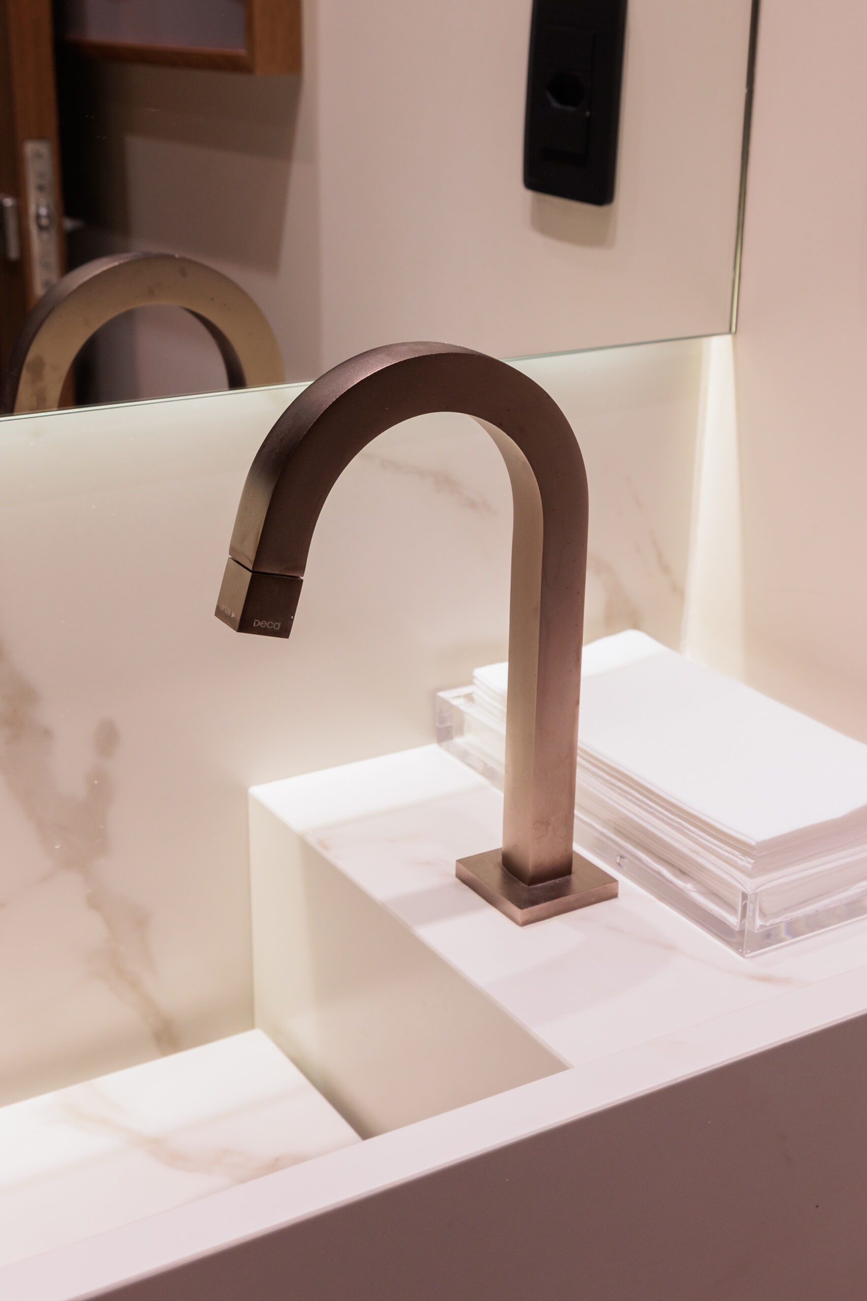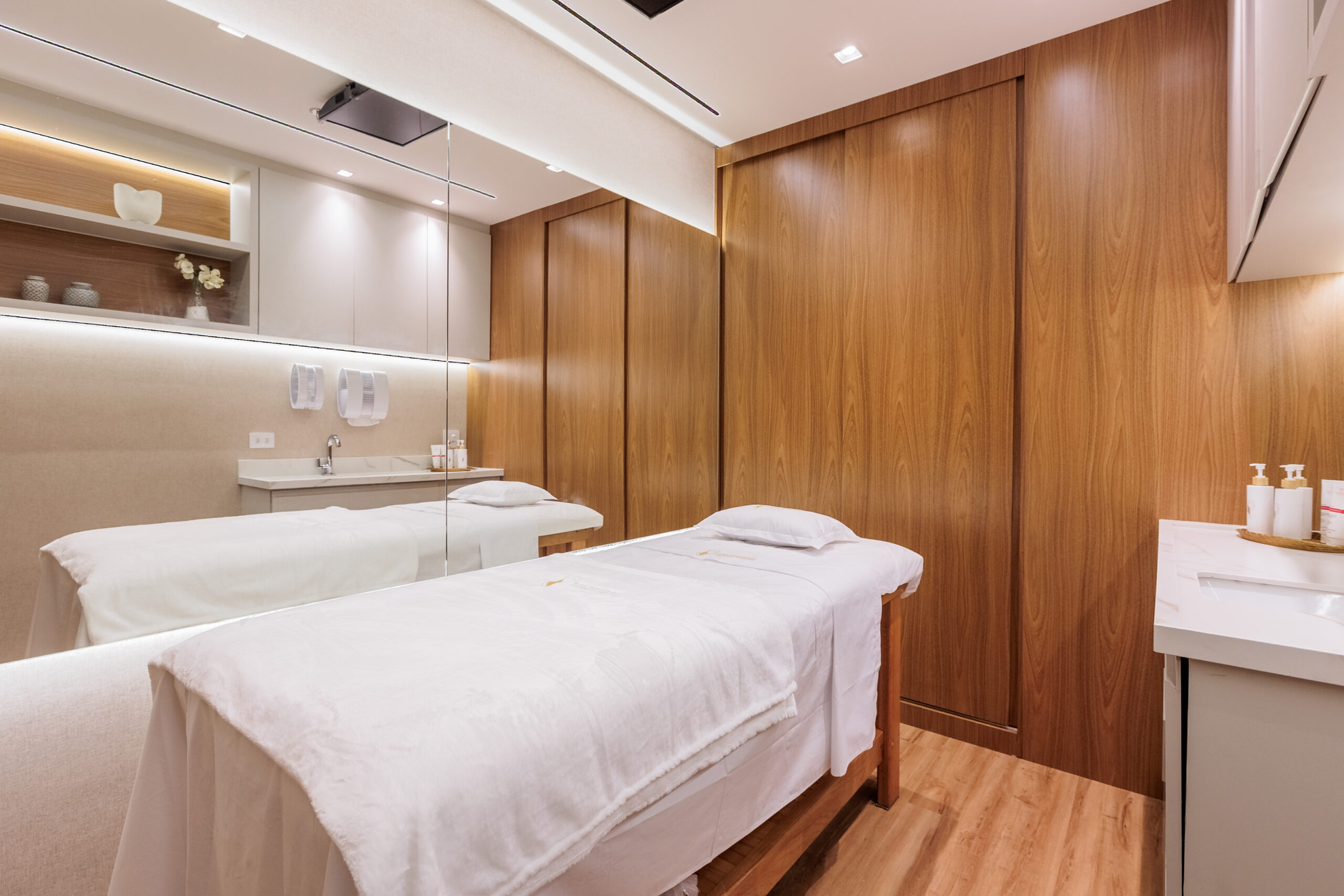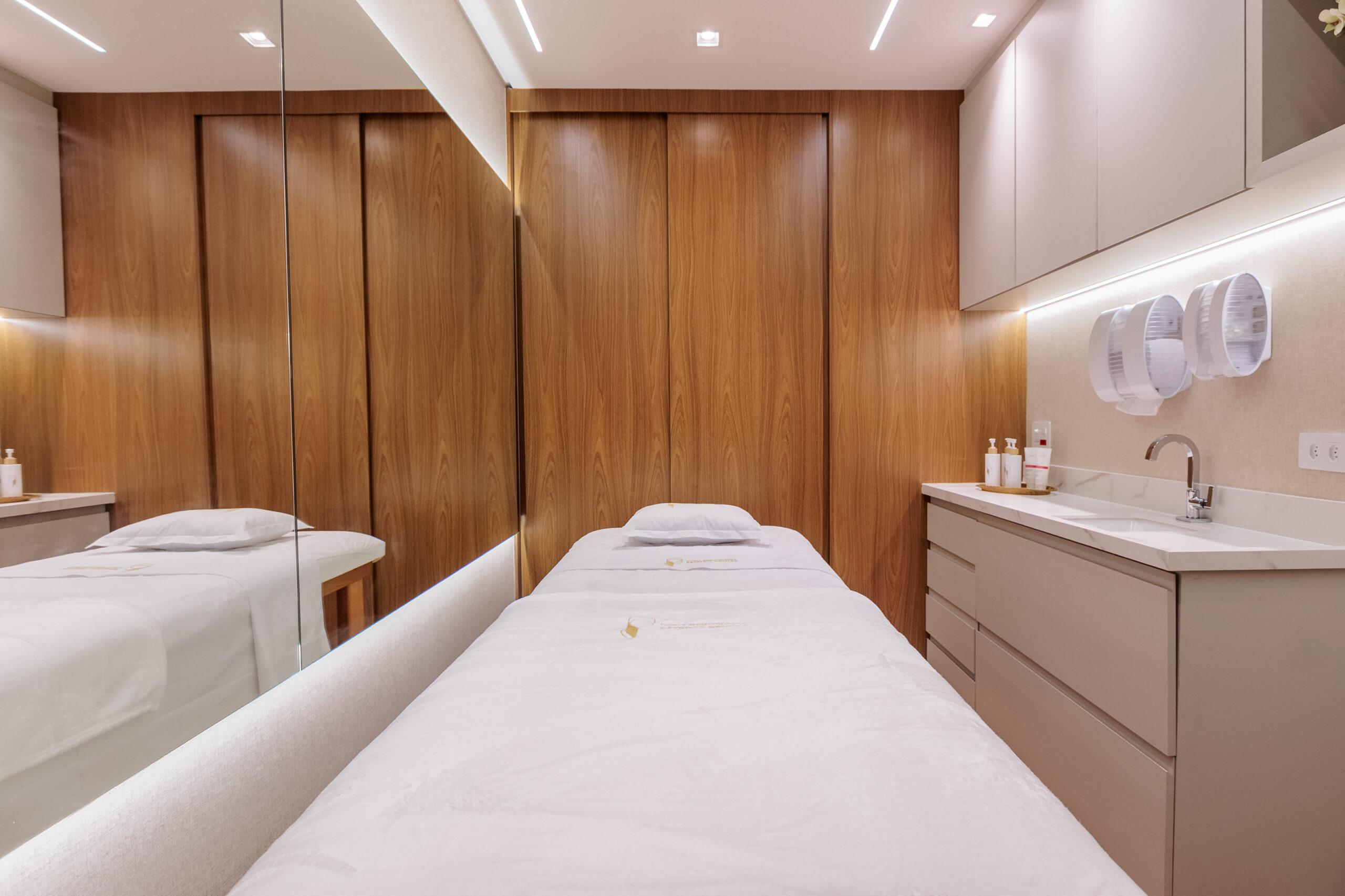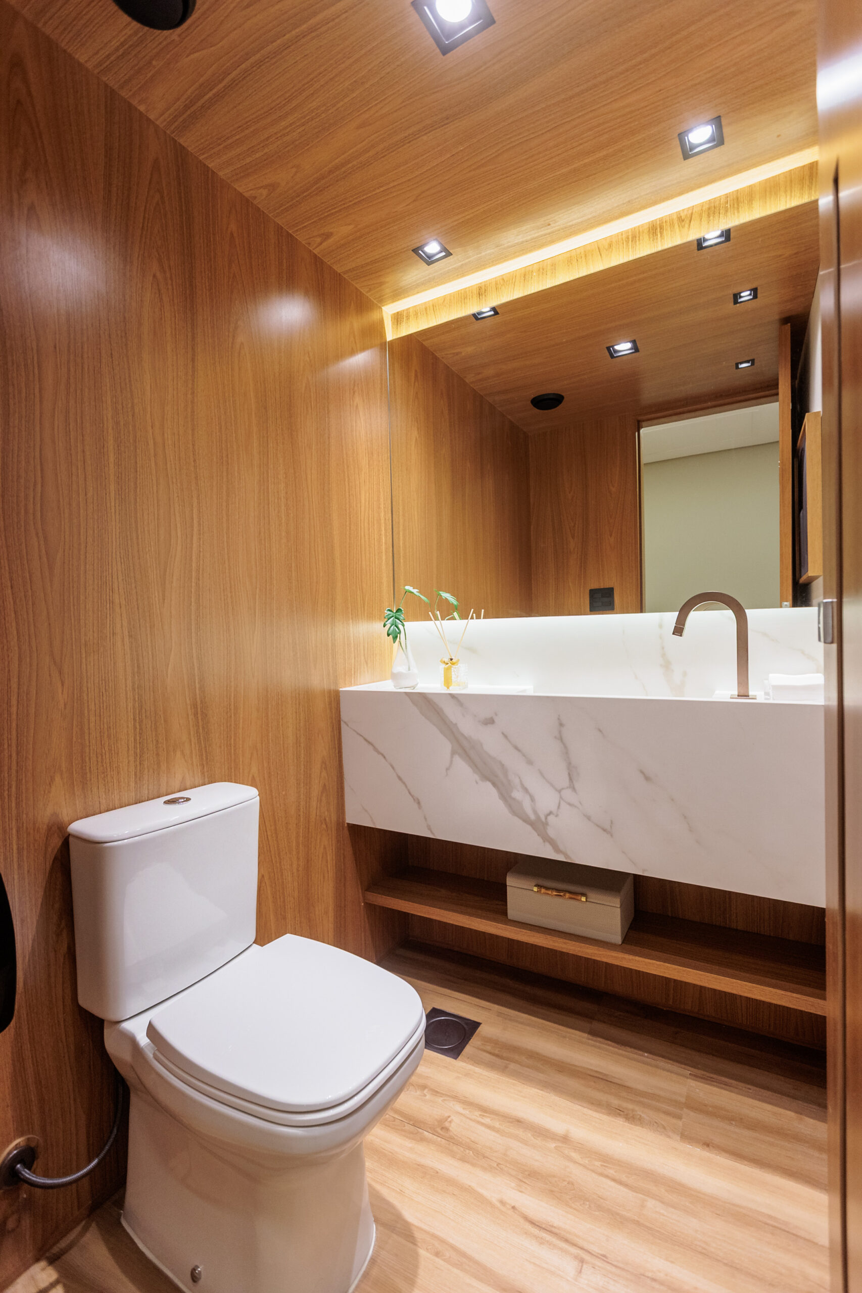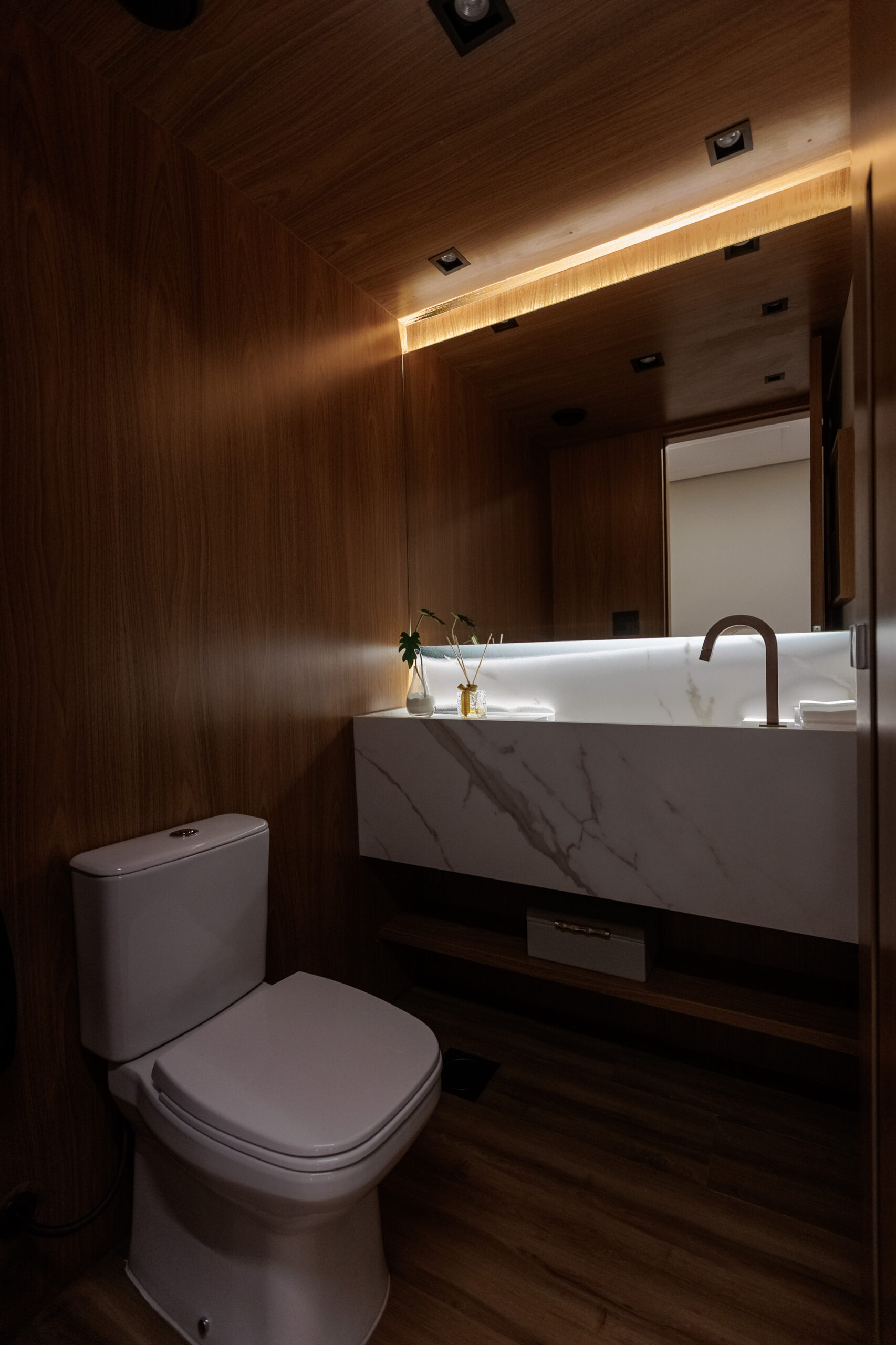 Em 90m², foram organizados três consultórios, 2 recepções, banheiros e áreas técnicas, com percursos independentes para preservar a privacidade. A madeira foi usada para trazer conforto, enquanto a iluminação foi planejada nos mínimos detalhes, para cada uso específico. O resultado é um espaço humano, funcional e sensível às necessidades do cliente.